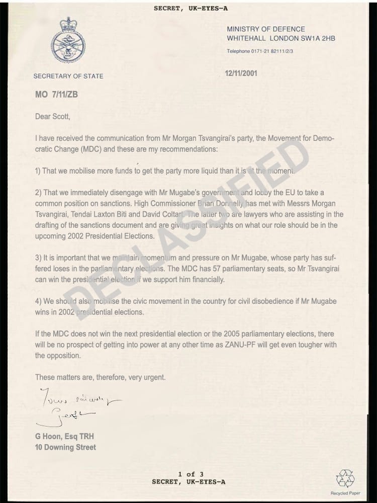The letter penned Further to that, the letter details how the British Government was desperate to influence the outcome of the 2002 Presidential elections.