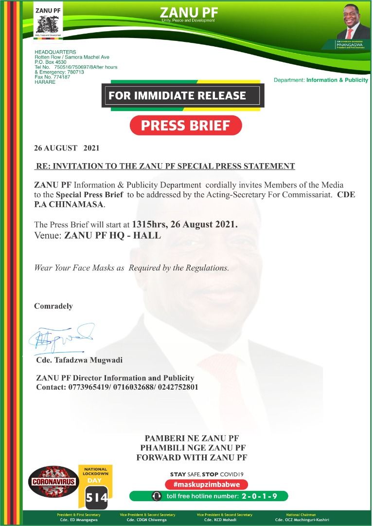 INVITATION TO A PRESS BRIEF BY THE ACTING POLITICAL COMMISSAR CDE PATRICK CHINAMASA