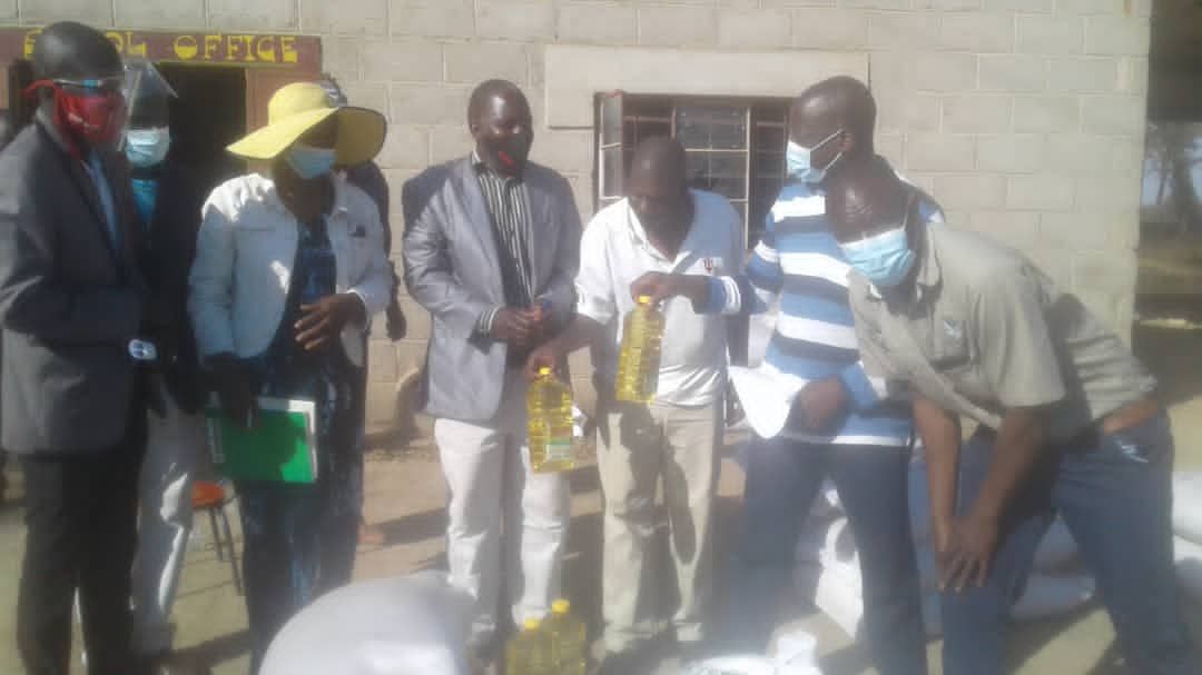 ZANU PF Chikomba West Constittuency and Health and Child Care Deputy Minister Dr John Chamunorwa Mangwiro( in blue stripped tshirt) rescue Chiwashira Primary school teachers with food stuffs after the teachers cottage was gutted by fire, loosing thousands of valueables in the process.