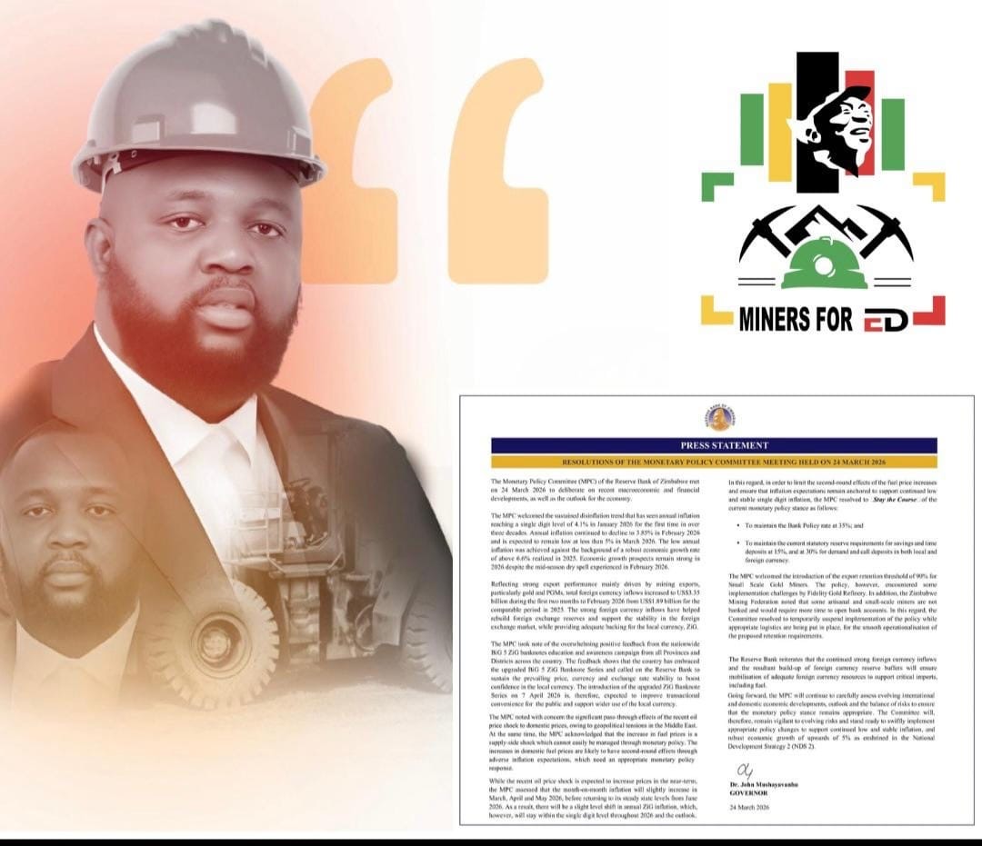Miners For Economic Development has warmly welcomed and fully endorsed the resolutions arising from the Reserve Bank of Zimbabwe (RBZ) Monetary Policy Committee (MPC) meeting held on 24 March 2026, describing the policy direction as a decisive step toward economic stability.
